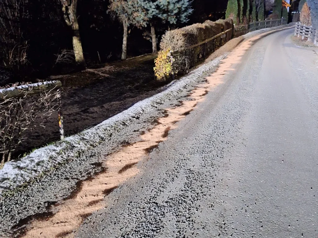 Zur Beseitigung einer ausgedehnten Ölspur wurde unsere Feuerwehr am 23.11.2025 um 18:21 Uhr nach Gobernitz alarmiert. Ein Streufahrzeug hatte während der Fahrt eine beträchtliche Menge Betriebsmittel verloren, wodurch sich eine rund 380 Meter lange Verunreinigung auf der Fahrbahn bildete.