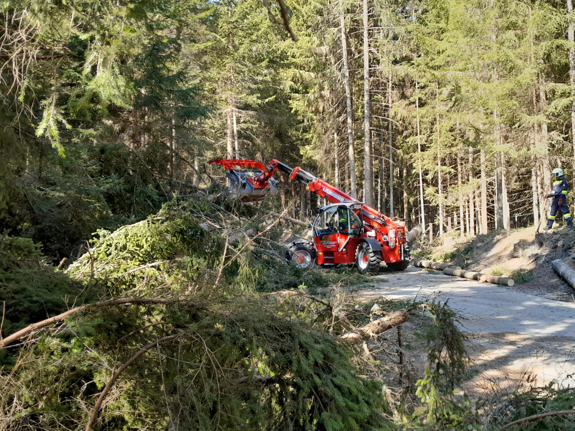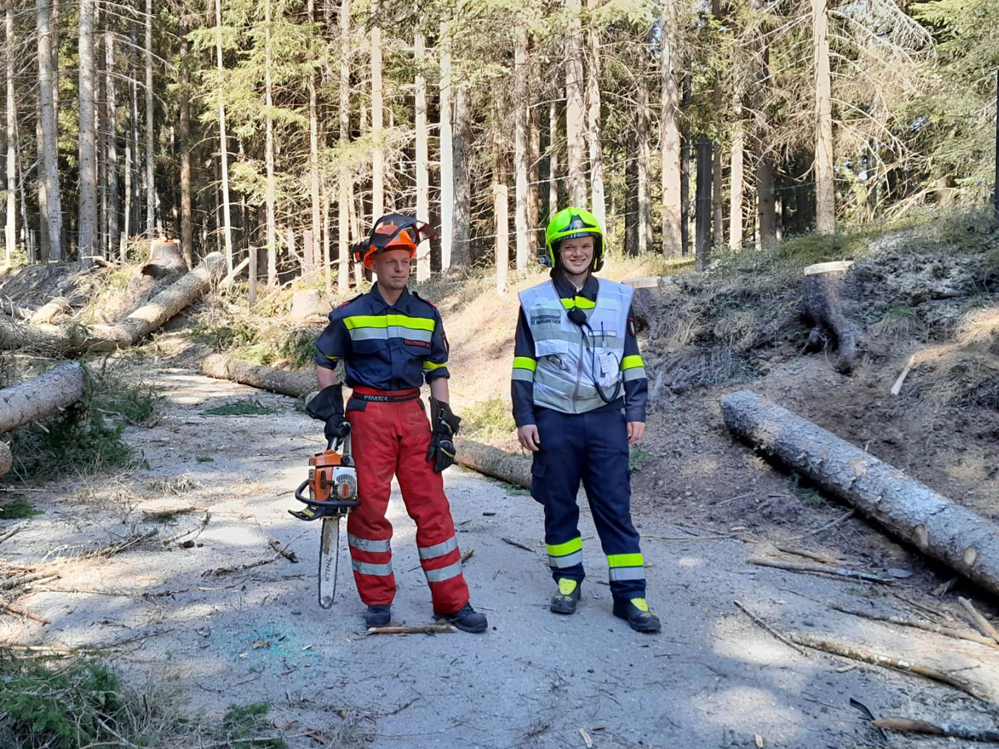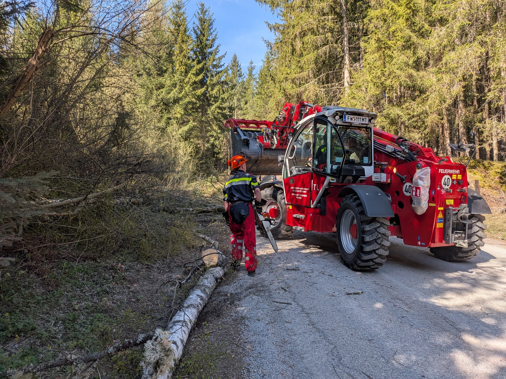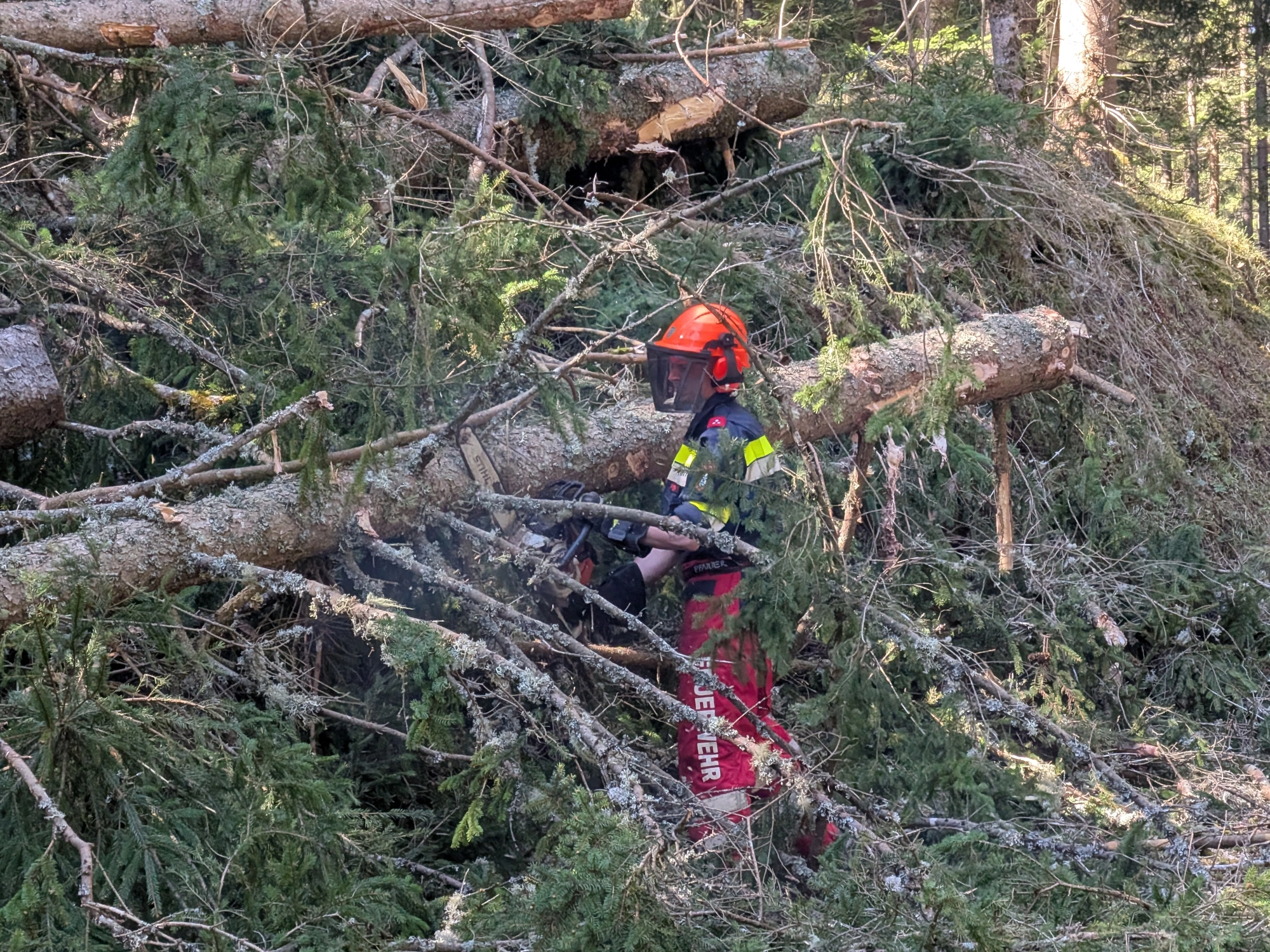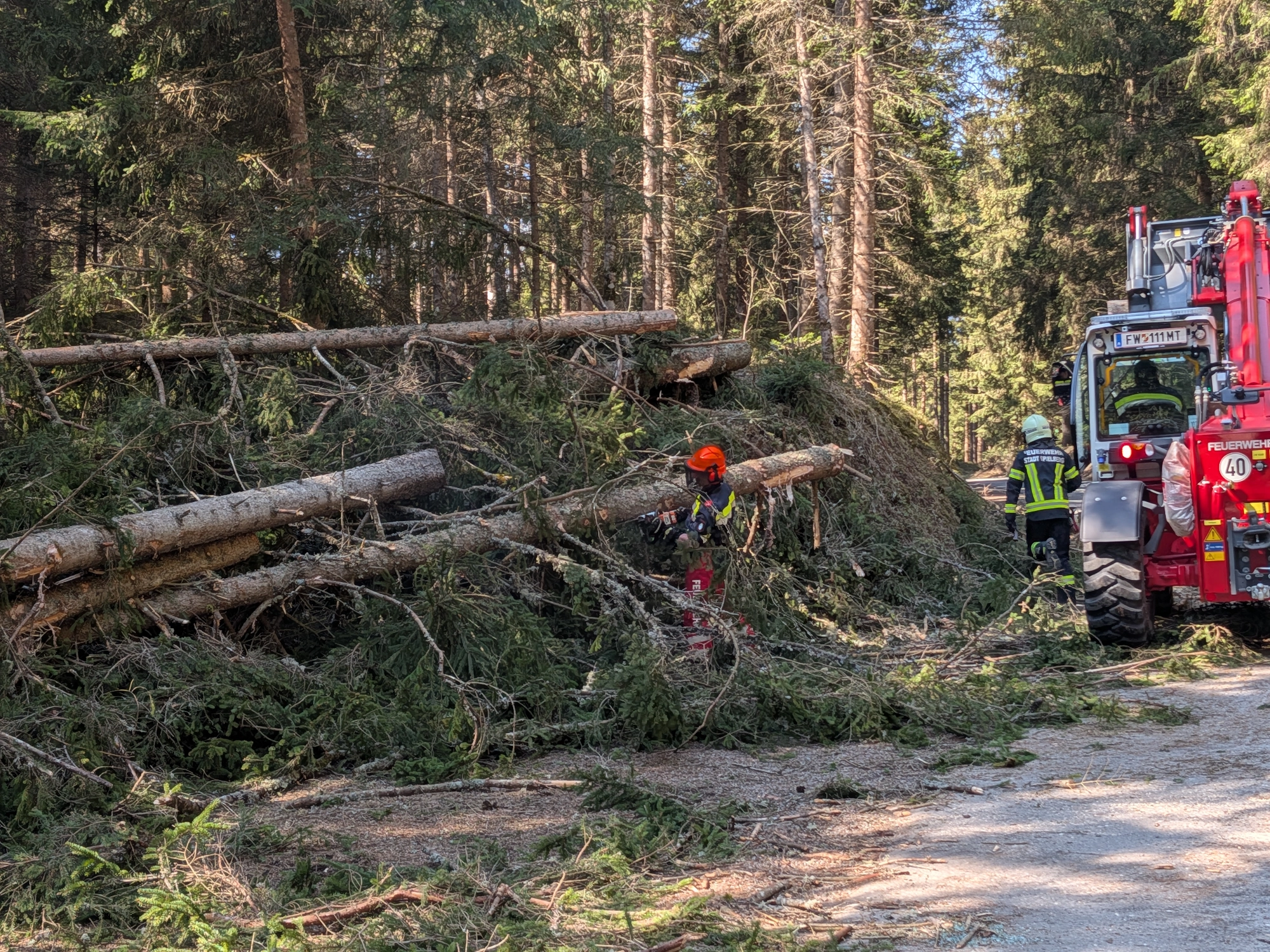 Nach dem Eintreffen des Zuges am Sammelpunkt beim Bahnhof Neumarkt in der Steiermark wurde die Besatzung unseres LFB-A unmittelbar zu einem Sturmschaden auf einer öffentlichen Straße entsandt. Vor Ort galt es, gemeinsam mit weiteren eingesetzten Kräften umgestürzte Bäume zu beseitigen. An der Einsatzstelle wurde ein unter den Baumstämmen eingeschlossener PKW vorgefunden, in dem sich eine bewusstlose Person befand. Diese musste von den Einsatzkräften rasch und schonend befreit werden. Anschließend erfolgte die Erstversorgung der verletzten Person durch einen Feuerwehrsanitäter bis zum Eintreffen der Rettungskräfte. Unter Einsatz eines Teleskopladers wurde die Fahrbahn in weiterer Folge vollständig von den Baumstämmen befreit und die Verkehrssicherheit wiederhergestellt.